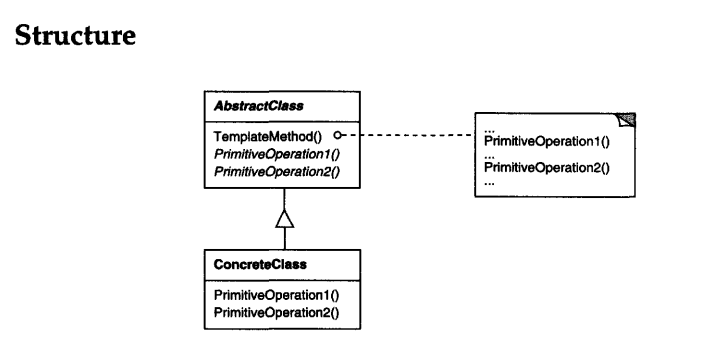 AbstractClass (Application) - defines abstract primitive operations that concrete subclasses define to implement steps of an algorithm. - implements a template method defining the skeleton of an algorithm. The template method calls primitive operations as well as operations defined in AbstractClass or those of other objects. ConcreteClass (MyApplication) - implements the primitive operations to carry out subclass-specific steps of the algorithm