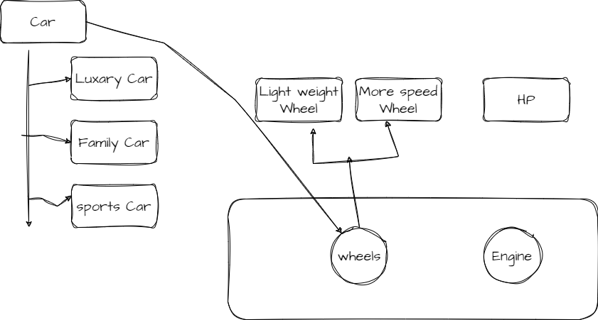 So, the engine and wheel components are the abstractions, and the actual car design (sports car or family car) is the implementation. This way, the company can change the engine or wheel components independently without affecting the sports car or family car design and vice versa. This helps the company to be more flexible and adapt to changing market needs quickly.