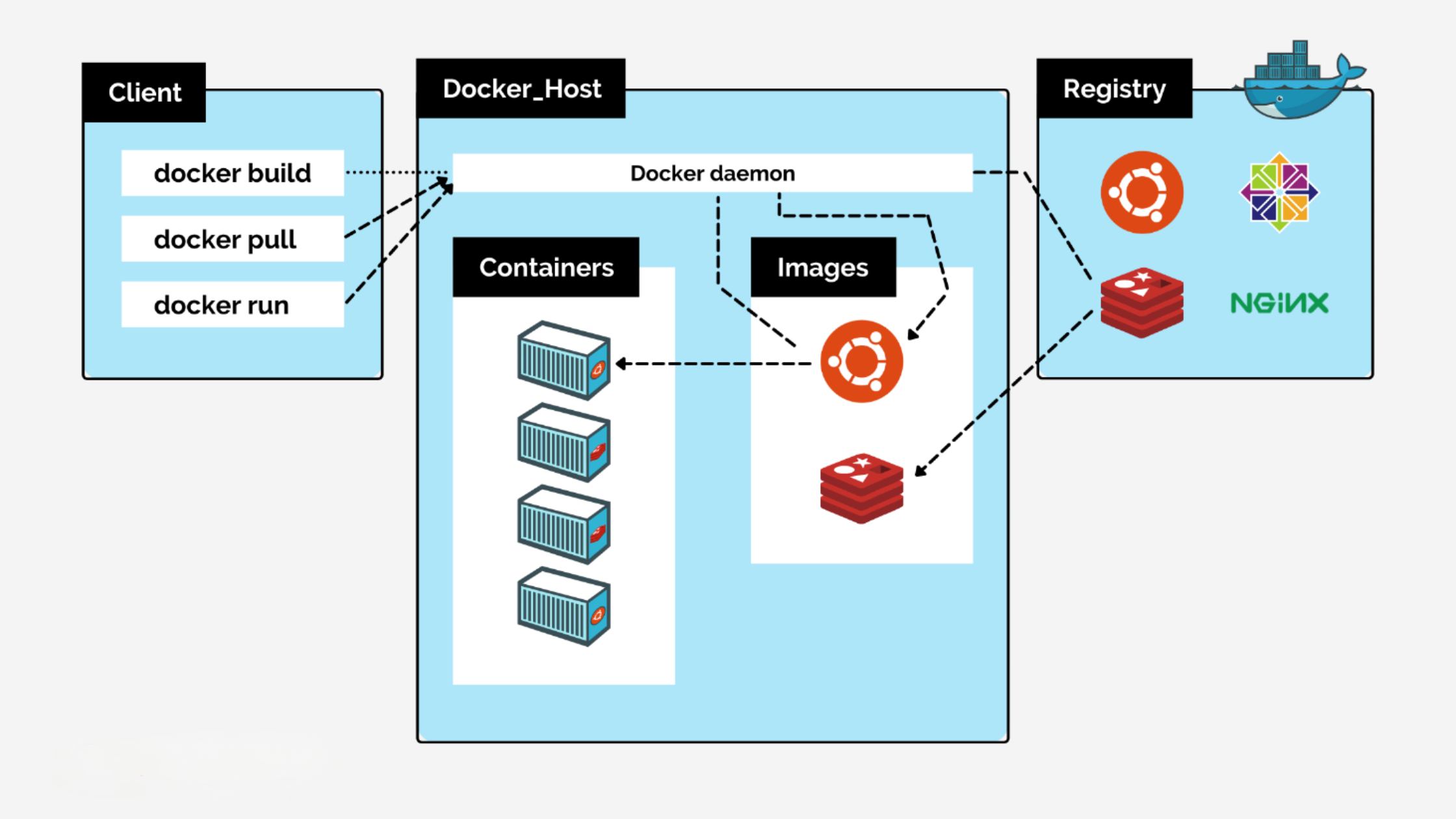 - Docker client, with which the user can interact with the docker. It includes the Rest Api that includes the interface to takl to daemon.