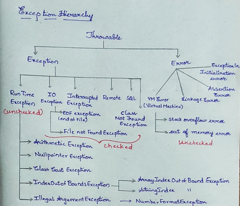 - Ex: Null Pointer Exception, Index Out of Bound Exception , Arithmetic Exception