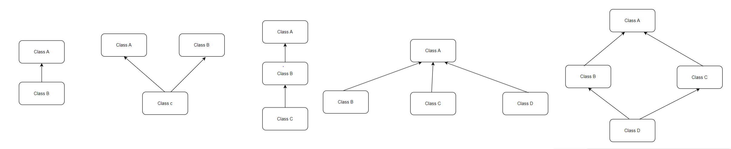 1.Single Inheritance 2. Multiple Inheritance 3. Multi Level 4.Hierarchial Inheritance 5.Hybrid Inheritance