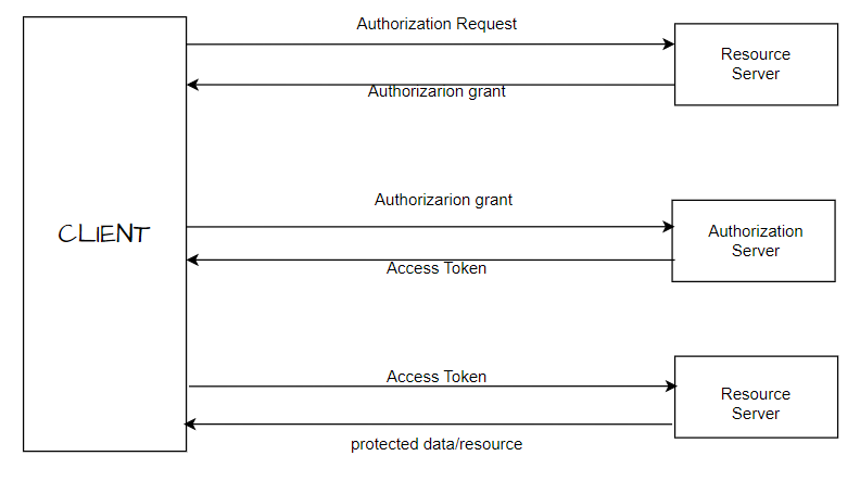 • The application requests an access token from the authorization server (API) by presenting authentication of its own identity, and the authorization grant
